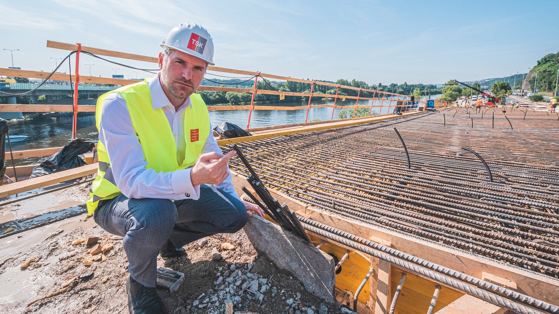 Přímo na fotce pak vidíte opravovanou nájezdovou rampu ze Strakonické. Ukazuji na ní na předpínací ocelové kabely, které celý most vlastně drží. Tyto kabely byly dříve na Barrandovském mostě na některých místech skrz naskrz prorezlé, takže výměna probíhá za 5 minut 12. Celý most navíc ještě technologicky vylepšíme použitím vysokohodnotného betonu. Ten zvyšuje únosnost a zatížitelnost mostu a chrání most před zatékáním vody.